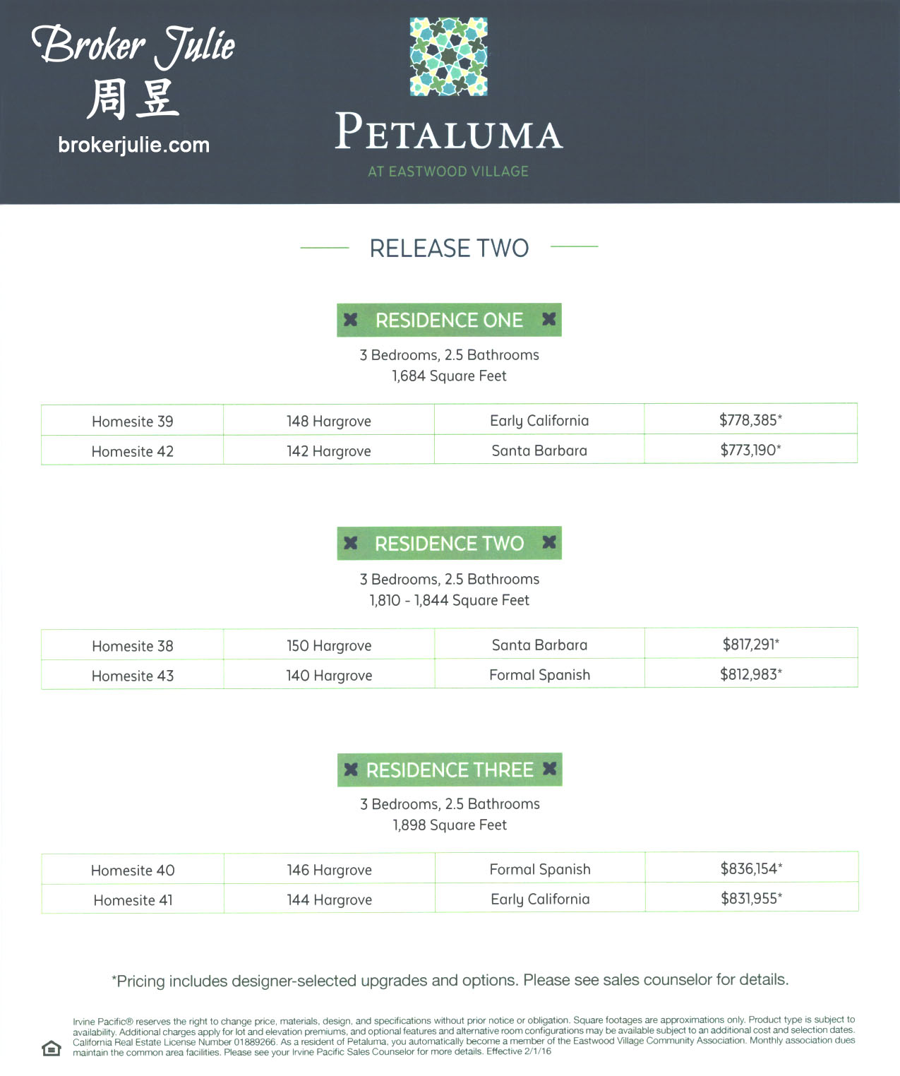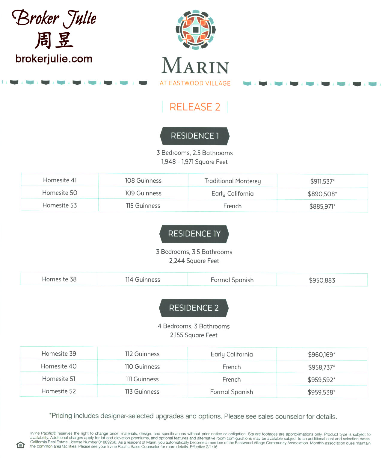 昱言:这几年最受国人青睐入住的美国城市加州尔湾市最新小区东木村小区(Eastwood Village)这两天盛大开盘,率先推出3个小社区,2房1161平方英尺最低只卖48万多美元!该社区总共会盖6个小社区,从2房到5房,售价从50万到100万美金不等,高中是在尔湾备受追捧的北木高中(Northwood Highschool), 绝对是投资自住的优先选择!有兴趣的朋友请与我联络,绝对可以帮您省钱!我家就住尔湾,这个新小区附近,而且对尔湾的每一个新旧社区都非常了解!